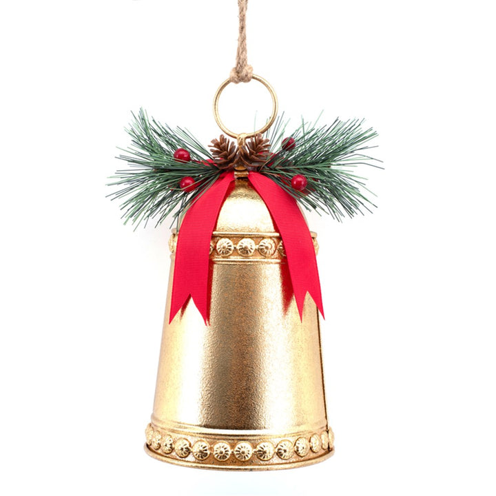 Add timeless elegance to your Christmas décor with this Gold Metal Bell Ornament. Featuring a classic metallic gold finish, pinecone and berry accents, and a festive red ribbon bow, this hanging bell brings a touch of traditional holiday charm to any space. Perfect for doorways, walls, mantels, or Christmas tree displays.