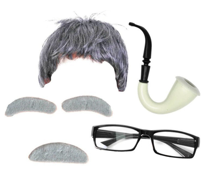 - Complete Set: Includes a gray wig, bushy eyebrows, a moustache, faux eyeglasses, and a classic smoking pipe.